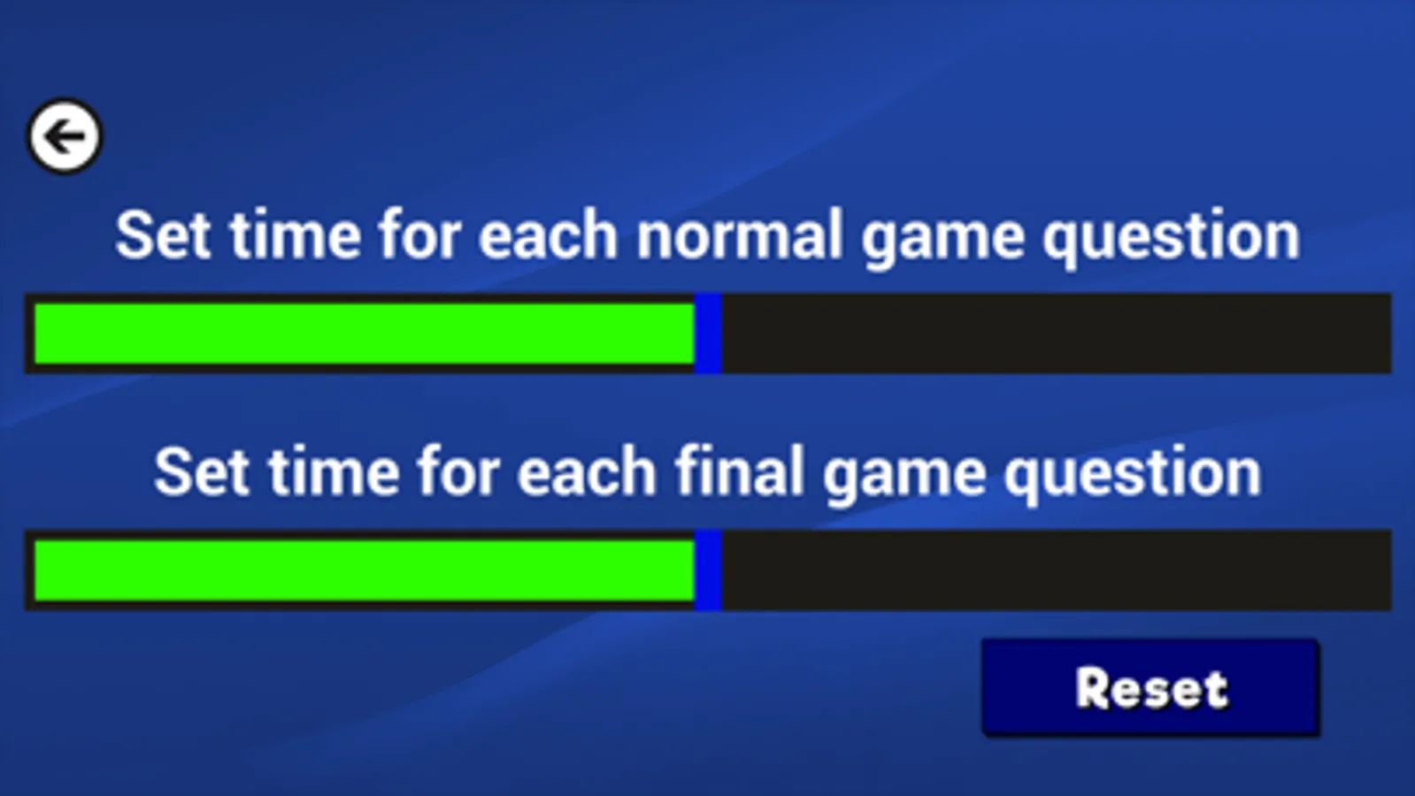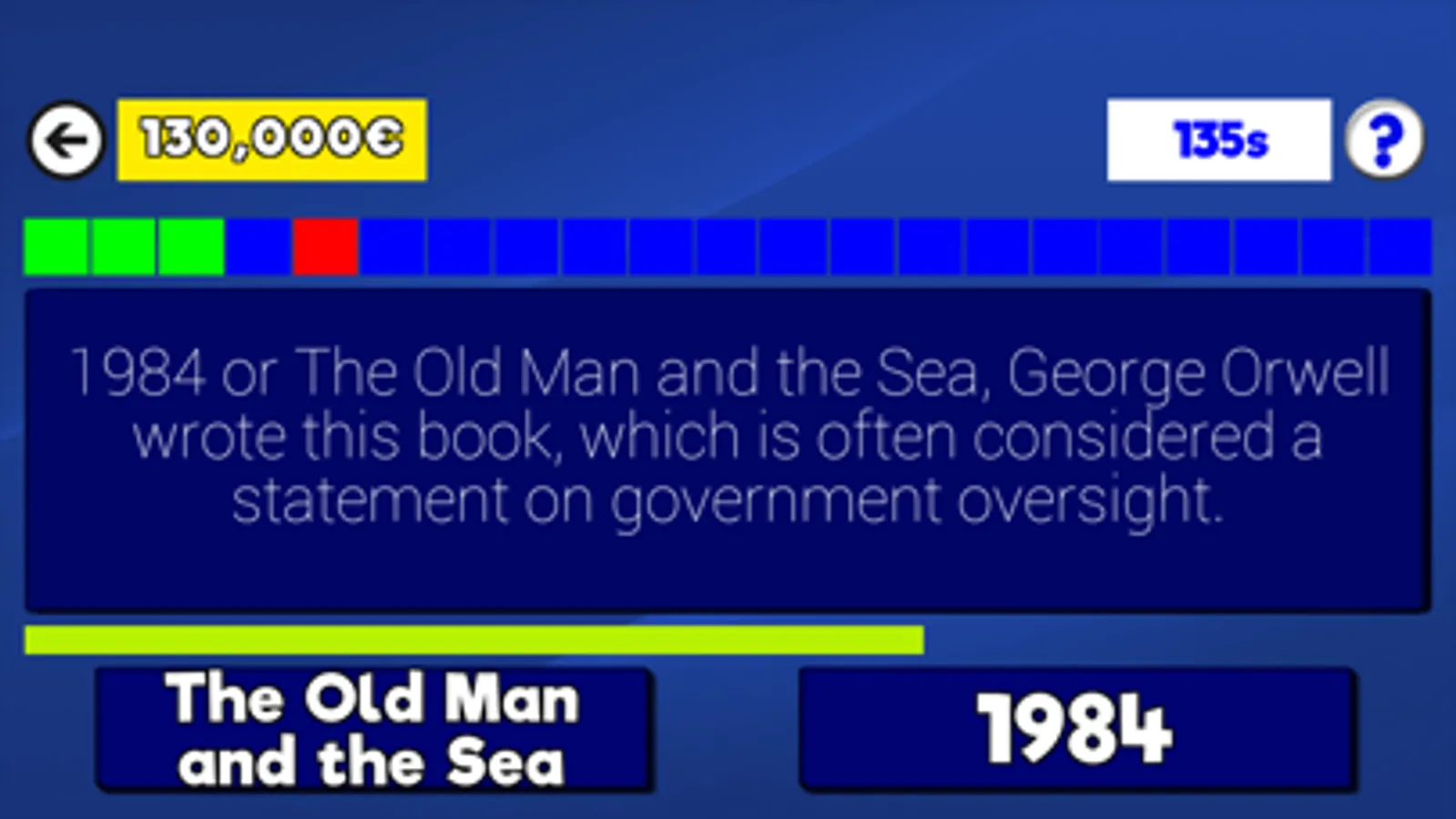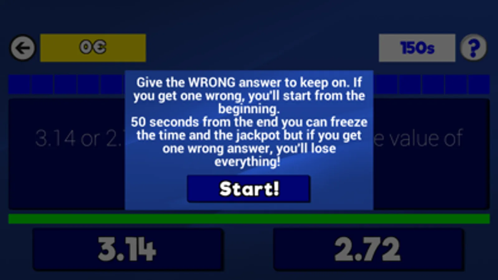 In the final game, you will have the chance to win the previously accumulated jackpot plus a bonus of € 100,000. To do so, you will have to give WRONG answers to 21 questions consecutively within 150 seconds. Each time you make a mistake you start again. At the end of 150 seconds a new 100 seconds countdown will start, in which you will have the chance to win the prize money that will decrease €1000 every second. 50 seconds from the end, the "freeze" button will appear within you can block the time (and the jackpot) and have the last chance to become a millionaire! (in game)