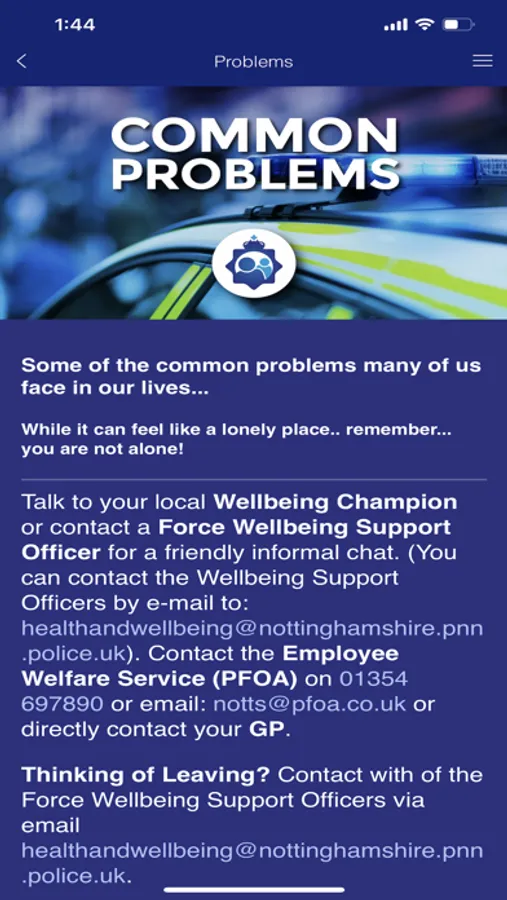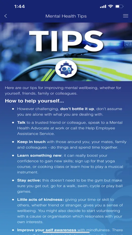The App covers a range of problems faced by officers and staff in the Police service, such as anxiety, stress, PTSD (Post Traumatic Stress Disorder), depression, eating disorders, self-harm and more. It gives practical advice and support on how officers can maintain good mental health, spot warning signs for themselves and others, plus advice on how to get help for themselves and colleagues.