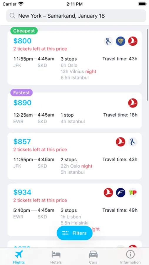 - Filter results by the cheapest flight, the quickest flight or a happy balance between the two