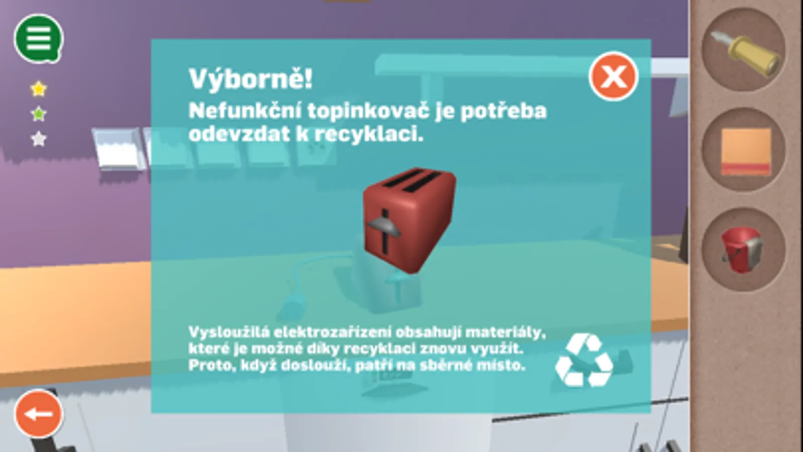 Úkolem hráče je najít a vyřešit úkoly schované v jednotlivých místnostech (v každé místnosti jsou 3). Každý úkol se skládá z několika kroků, které je potřeba udělat ve správném pořadí, jen tak je možné úkol splnit. Hráč musí prověřit funkčnost některých elektrozařízení, zkusit je opravit a nefunkční přístroje odnést na sběrné místo k recyklaci. Úkol je splněn sebráním předmětu určeného k recyklaci (elektrozařízení, baterie, žárovka apod.).