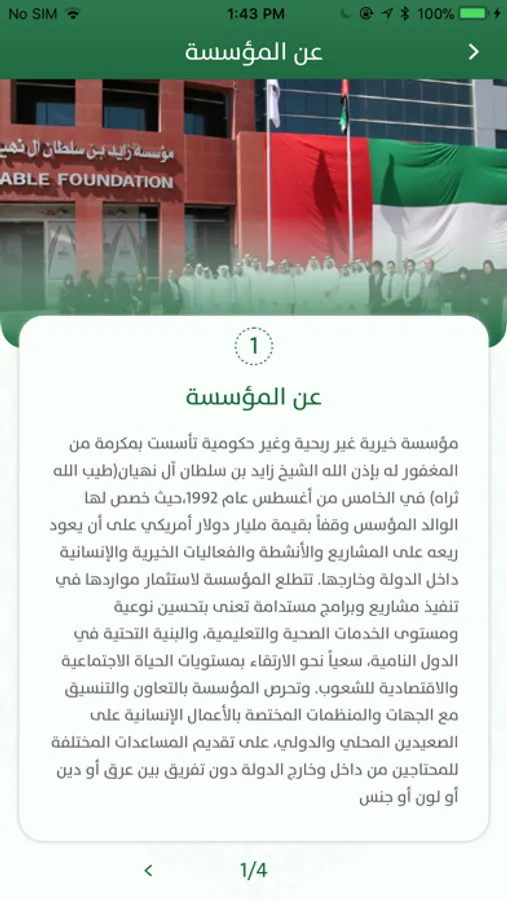 هذا التطبيق مقدم من مؤسسة زايد للاعمال الخيرية والانسانية هي مؤسسة حكومية خيرية غير ربحية تعمل على توفير المالية للمحتاجين من داخل اوخارج الدولة في مختلف المجالات الانسانية مثل الحج والصحة والتعليم من خلال تقديم طلبات يتم من خلالها اكمال بعض البيانات اللازمة لتحديد الاشخاص الاكثر احتياجاً واستحقاقاً لهذه الخدمة.