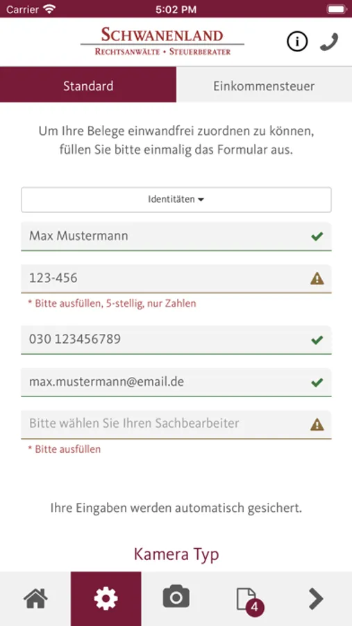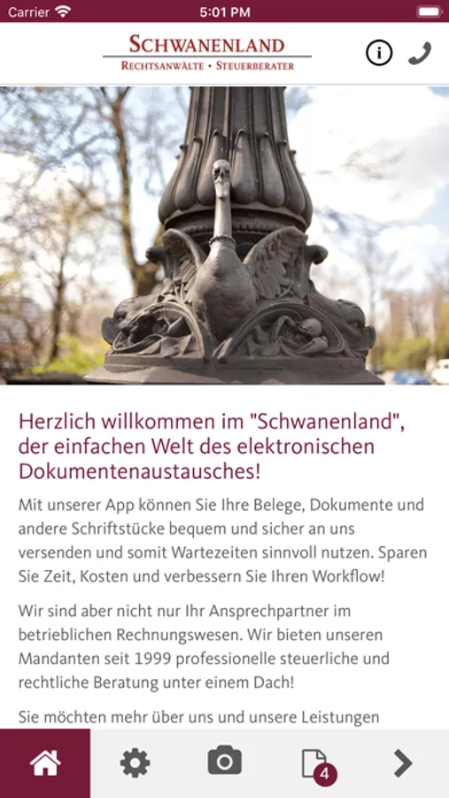 Mit dieser App können Sie Belege, Dokumente und andere Schriftstücke von überall und zu jeder Zeit an die Kanzlei Schwanenland Rechtsanwälte und Steuerberater senden. Sparen Sie Zeit, Kosten und verbessen Sie Ihren Workflow! Das umständliche Heraus- und Zusammensuchen von Dokumenten am Jahresende entfällt. Ihre kostbare freie Zeit müssen Sie nicht mehr für das Finanzamt opfern.