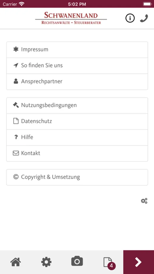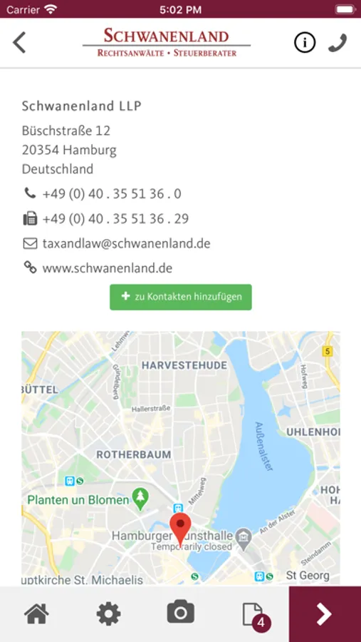Eine Liste Ihrer Ansprechpartner in unserer Kanzlei findet sich ebenfalls in der App. So können Sie schnell und übersichtlich Ihren Ansprechpartner finden und ihn aus der App heraus anrufen oder ihm eine E-Mail senden.