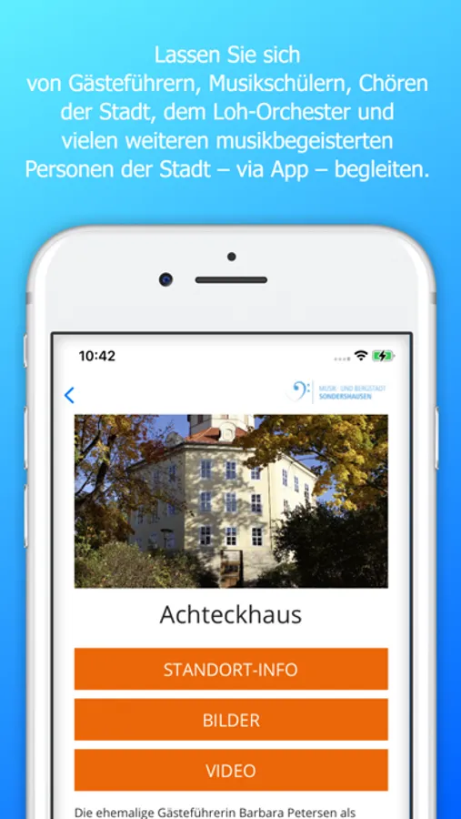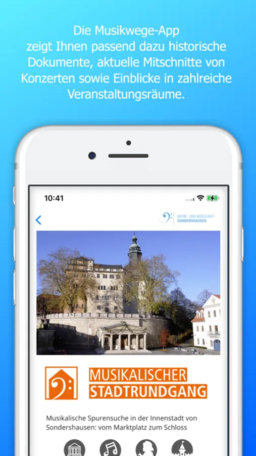 Entdecken Sie die beeindruckende Musikgeschichte und das vielfältige Musikleben der Musikstadt Sondershausen mit der „Musikwege-App“. Passend zu den Stationen des Musikalischen Stadtrundgangs (3,7 km) zeigt sie historische Dokumente, aktuelle Mitschnitte von Konzerten sowie Einblicke in zahlreiche Veranstaltungsräume. Lassen Sie sich von Gästeführern, Musikschülern, dem Loh-Orchester und vielen weiteren musikbegeisterten Personen der Stadt – via App – begleiten.