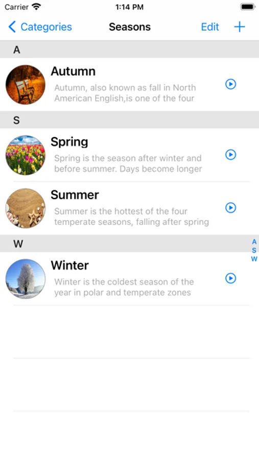 If you create the category "Seasons of the Year", then you will have to add articles related to this category, by clicking on the row.