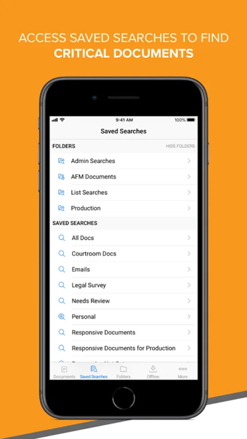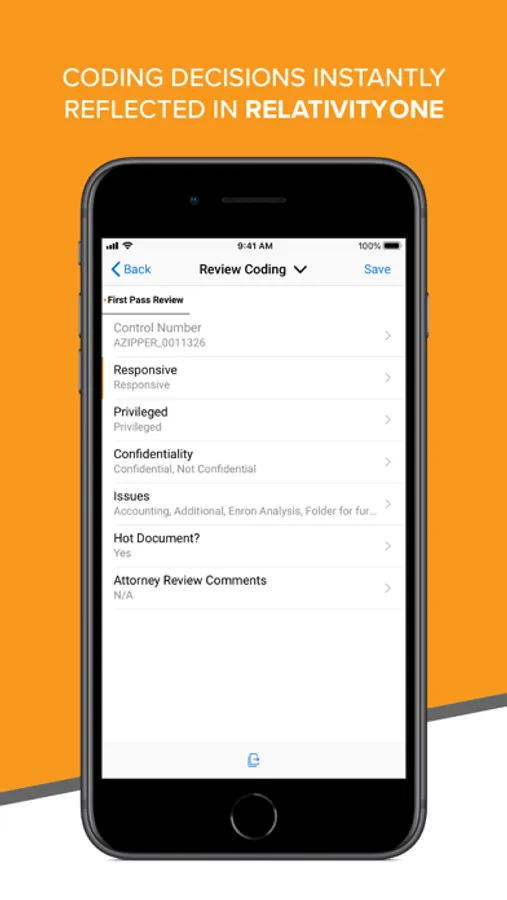 RelativityOne provides everything needed to tackle document review challenges. Get the control and flexibility you need to amplify your team’s efforts and get to the substance of a matter. Whether you’re in the office or on the go, the mobile application for RelativityOne allows you to securely share documents, access Views and Saved Searches, and code documents with all decisions instantly reflected in RelativityOne.