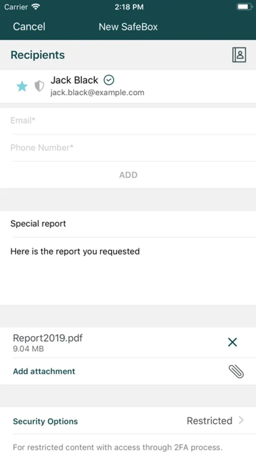 • Address your SafeBoxes to your usual contacts: manually type email addresses, select recipients from your mobile or from your enterprise account, use favorites for quick selection.