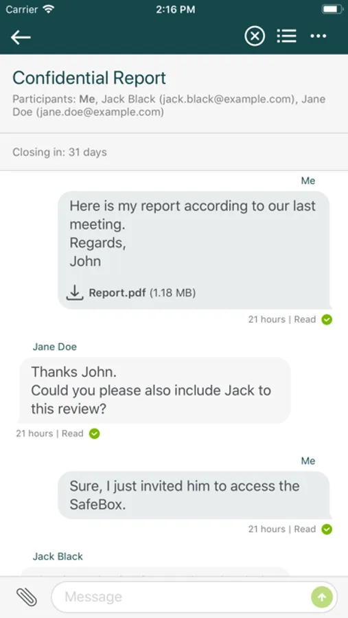• Manage all your SafeBoxes directly from your mobile: follow/unfollow, read/unread, reply, close, delete, manage participants...