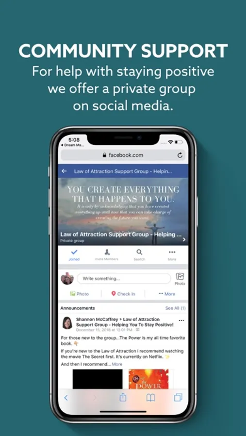 We offer a private support group for those wanting to learn more about the Law of Attraction and to help keep you positive. Check out the link inside the app to join the group on social media.