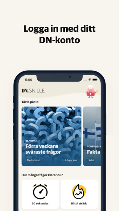 DN Snille är en quizapp från Dagens Nyheter, helt utan reklam. Utmana dig själv med nya quiz varje dag och följ din utveckling över tid. Blir du blåbär eller mästare?