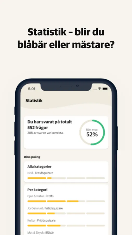 - Quiz med olika teman som Kultur, Vetenskap, Sport och Mat & Dryck