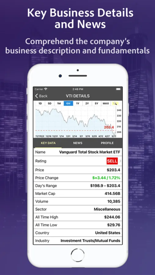 • View key details including dividends, debt, income, volatility, revenue, earnings dates, EPS, Moving Averages.