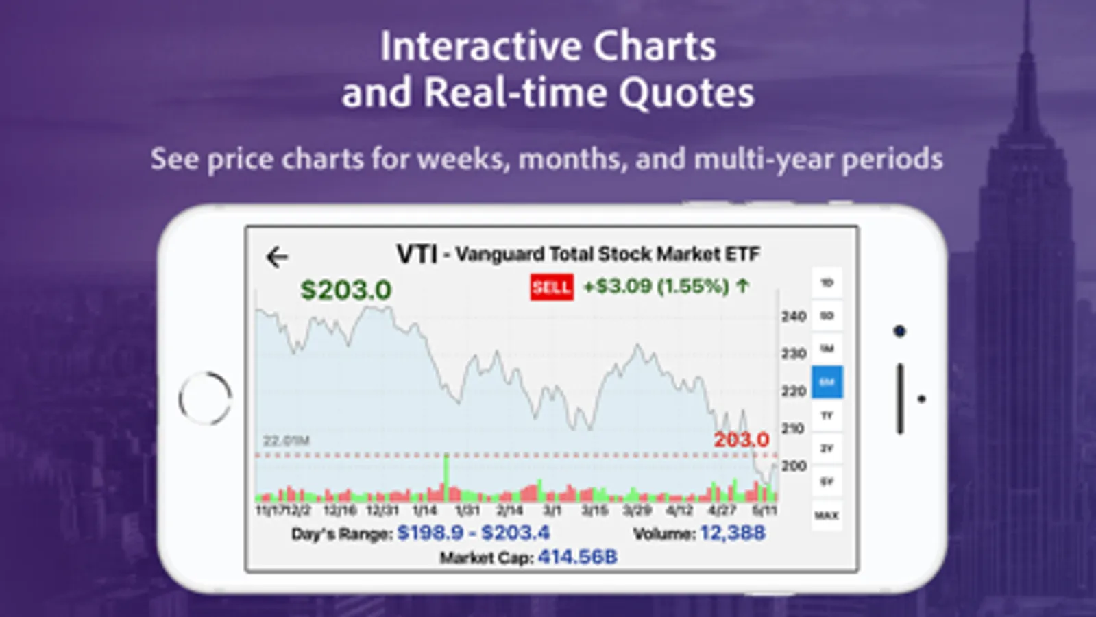 • Tap any ETF ticker in any portfolio to see price charts for weeks, months, and multi-year periods.