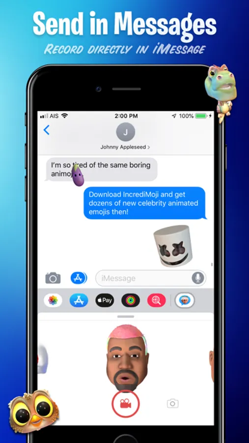 Incredimoji works directly in iMessage - you don’t have to open the app to send your friends a face filter video - just click the icon in iMessage and you’re good to go! Or you can save your custom videos and they can be used everywhere you can send or post a video (Email, iMessage, whatsapp, Line, Instagram, Snapchat, WeChat, Kik …)