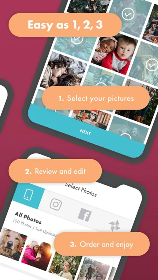 Print your photos in three easy steps. First, upload your photos from your native phone Photos app, Instagram, Facebook, or Google Photos and then, select the photos you’d like to print. Next, review your photos before they are printed – zoom in on the best parts, or edit the crop. Finally, hit checkout – you’re all ready to print the photos that mean the most to you.