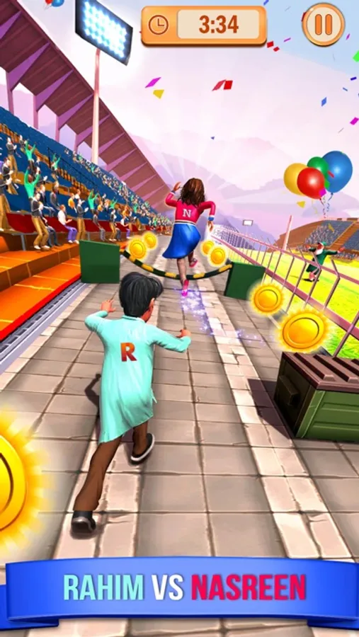 Rahim is furious due to mischievous activities of Nasreen. Their fight has made its way to cricket stadium where the epic chase battle begins in new game of 2019 Nass Nasreen- Endless runner. Nasreen is running at full speed while Rahim is chasing her in cricket stadium right between the match. Public is shouting in favor of Nasreen but Rahim looks confident to catch her. Can Rahim catch Nasreen??