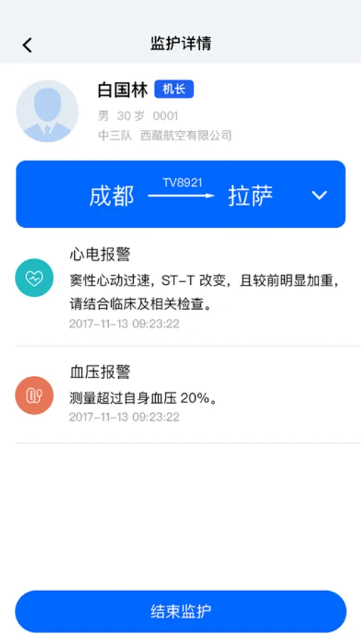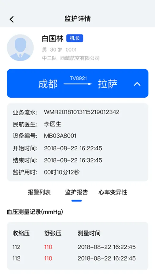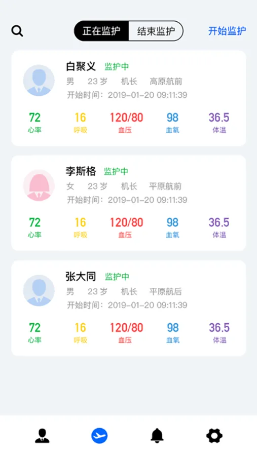 航医Plus是通过网络将各个民航飞行员佩戴的多参数监护仪所得到的各项监测波形和生理参数同时集中显示在航医Plus上,使医务人员对民航飞行员实施有效的实时监护。