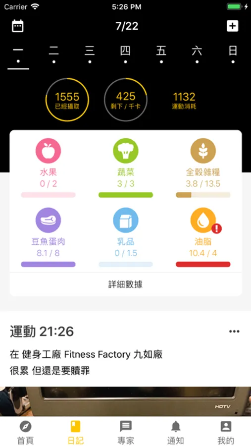 • 日記紀錄:每次運動訓練內容與每日飲食詳細記錄,攝取、消耗多少熱量都知道