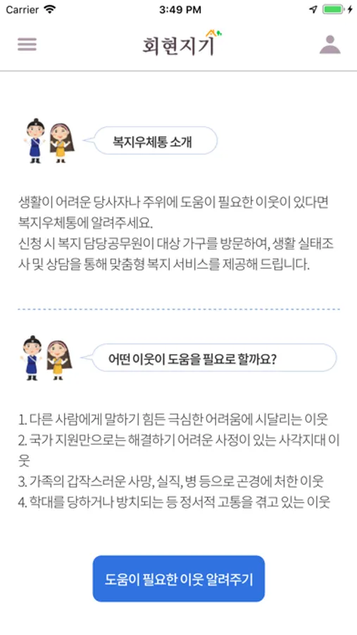 생활이 어려운 당사자나 주위에 도움이 필요한 이웃을 알려주시면 담당 공무원이 생활 실태조사 및 상담을 통해 맞춤형 복지 서비스를 제공해 드립니다.