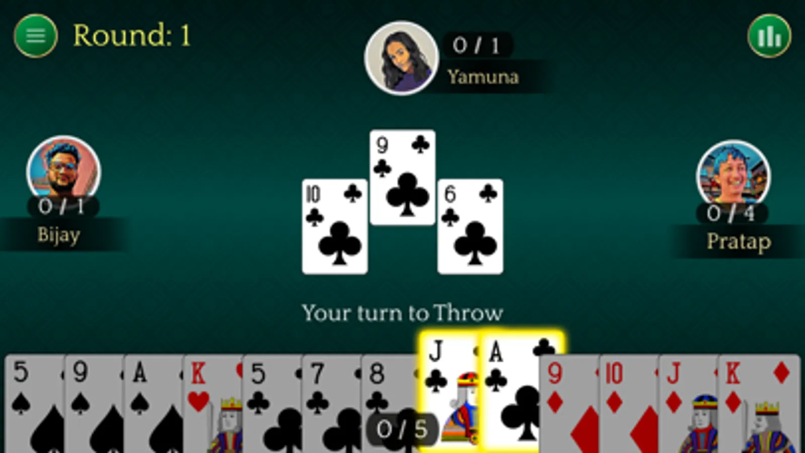 Four players play individually with a pack of 52 cards. There are 5 game rounds in this game, and scorekeeping is done separately for the 5 rounds. In each round, 13 deals are played. In every deal, each player throws one card, so four cards make a deal. Thirteen tricks make a Round. Five rounds make a game of Callbreak.