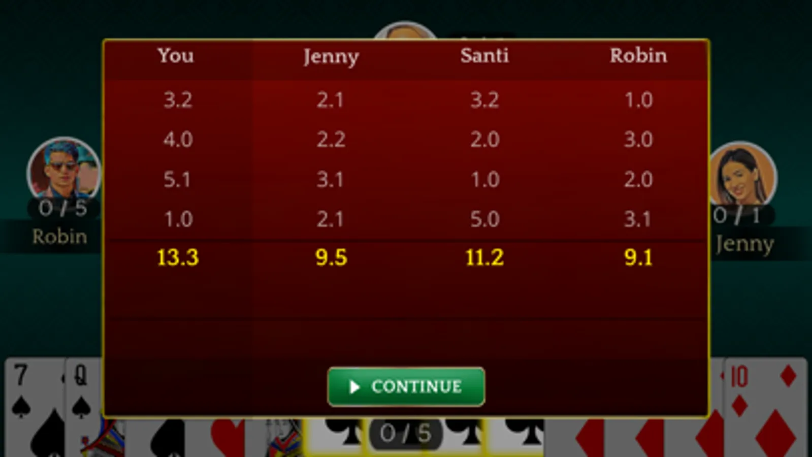 After 13 deals are played for the round, scorekeeping is done. The player who has won the highest number of deals after 5 rounds will be the winner.