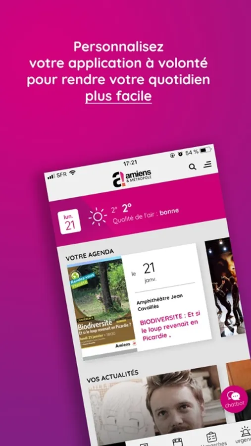 « L’appli » de la ville d’Amiens et d’Amiens Métropole est destinée à fournir des informations pratiques et de réels services au citoyen. L’actualité du territoire, les horaires de votre piscine, connaître la qualité de l’air, l’agenda des événements, payer vos factures…tout est là, sur un clic !