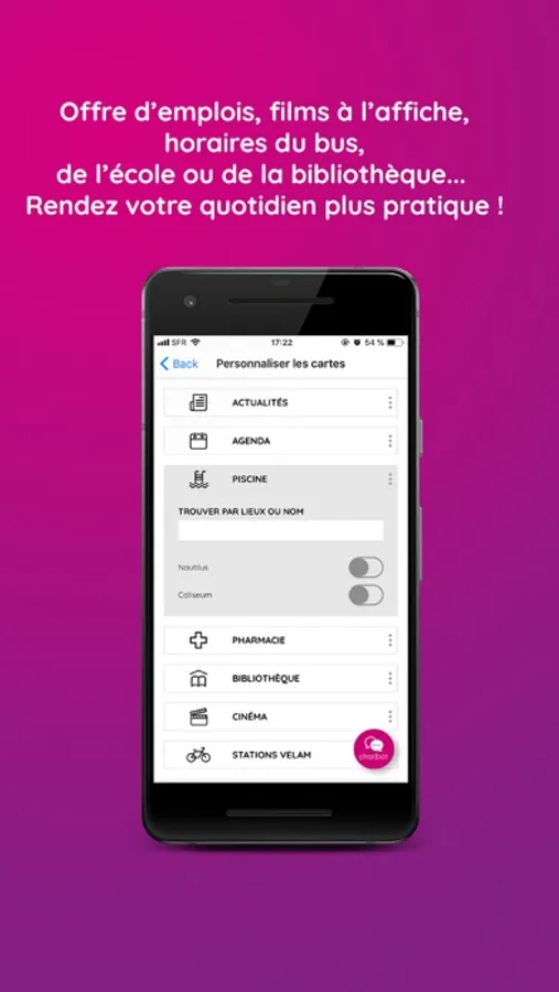 Non car vous allez pouvoir personnaliser votre application ! Actualité, agenda, piscine, pharmacie, bibliothèque, écoles, crèches… composer votre application et ses services à votre image, selon vos besoins ! Inutile de naviguer plusieurs fois, « l’appli » enregistre vos préférences et les met en avant des son ouverture. Vous pouvez consulter uniquement les actualités sportives par exemple, l’agenda des concerts à la lune des pirates, le numéro de téléphone de l’école, les horaires de votre déchetterie, les horaires de passage du prochain bus, les films à l’affiche des cinémas et bien d’autres !