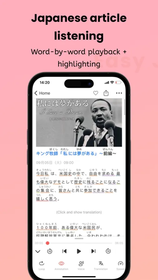 Accumulate knowledge through reading and intensive listening to Japanese articles, and strengthen your Japanese skills through AI oral conversations to ultimately improve your Japanese proficiency.