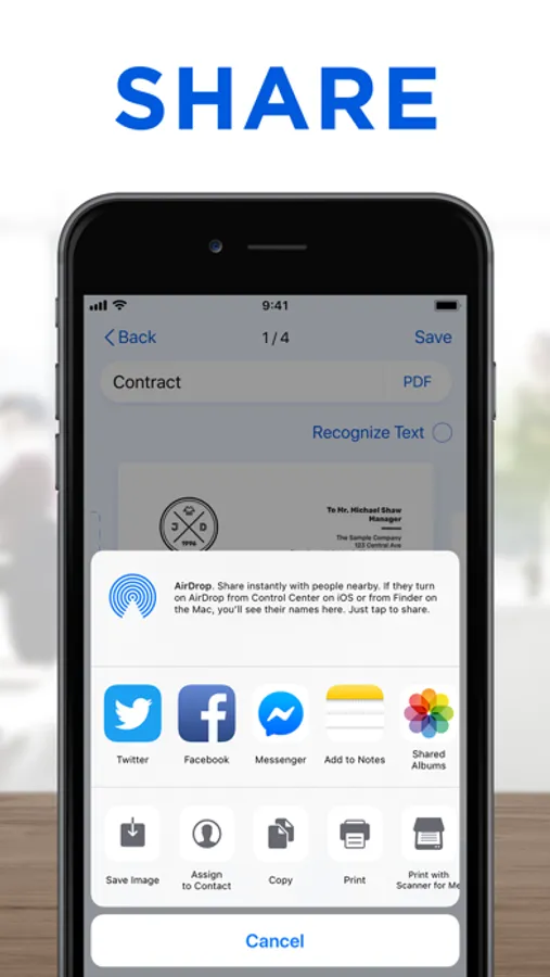 * Share scans separately or send a number of files in one PDF file Mail, iMessage or save to camera roll