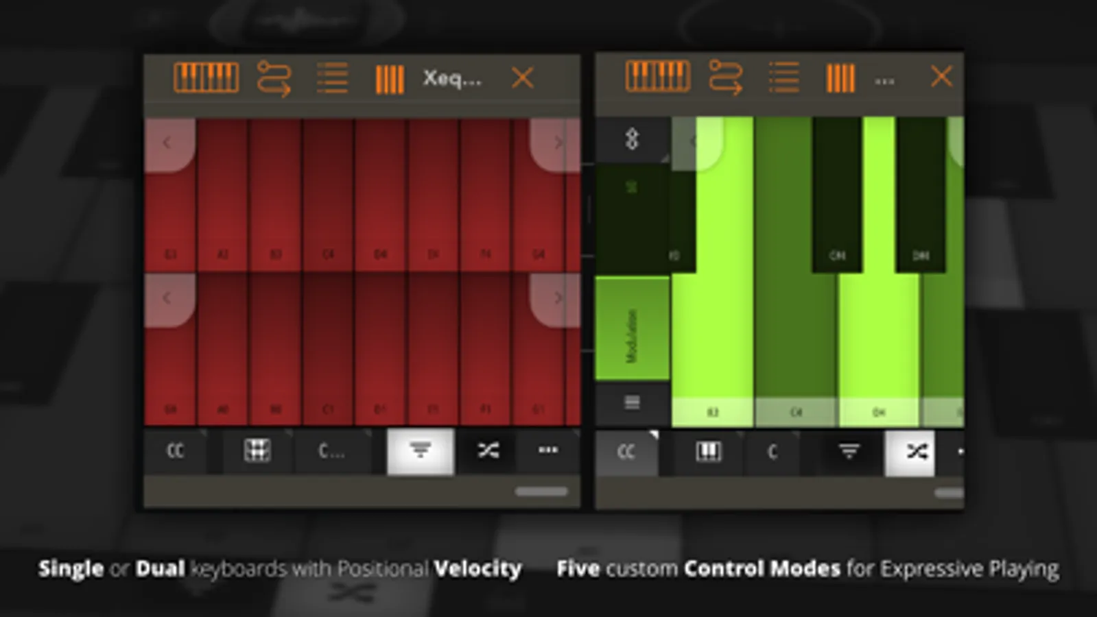 - Any number of MIDI CCs (controllers) can be freely configured and shown as touch ribbons next to the keyboard