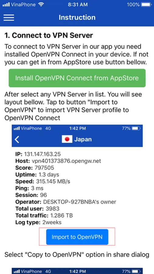 You can connect any VPN Server in application by import VPN server profile to third party app (OpenVPN Connect). Sometime some server can't access but don't worry you can choose another server to connect. Because VPN Server come from volunteer it may provide use their personal computer so sometime it's unavailable to connect. You can choose VPN Server with long uptime it often available to connect.