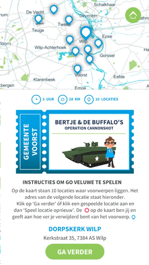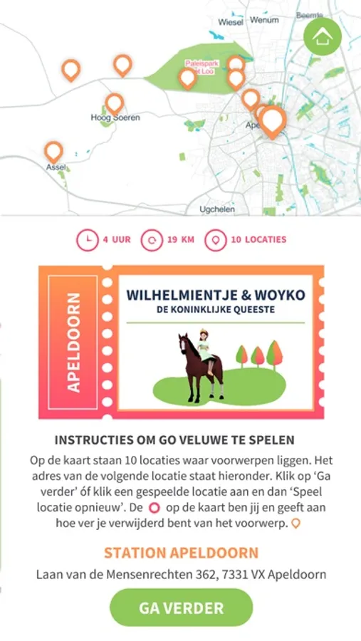 De Veluwe zit boordevol spannende geheimen en historische schatten. Lijkt het jou ook zo gaaf om die te gaan ontdekken? Dat kan als je Go Veluwe outdoor adventure games gaat spelen! Met Go Veluwe fiets je binnen iedere routegame naar verschillende gamelocaties. In elke routegame is de hoofdfiguur een kind dat in de tijdmachine van Go Veluwe vanuit het verleden naar het heden is geteleporteerd. In Apeldoorn is de eerste route gelanceerd waarin Koningin Wilhelmina, als de tien-jarige Wilhelmientje, de hoofdfiguur in het verhaal is. Samen met Wilhelmientje ga je op een 'Koninklijke Queeste'. Tijdens deze zoektocht ontdek je verschillende plaatsen in Apeldoorn waar Wilhelmientje haar sporen heeft achtergelaten.