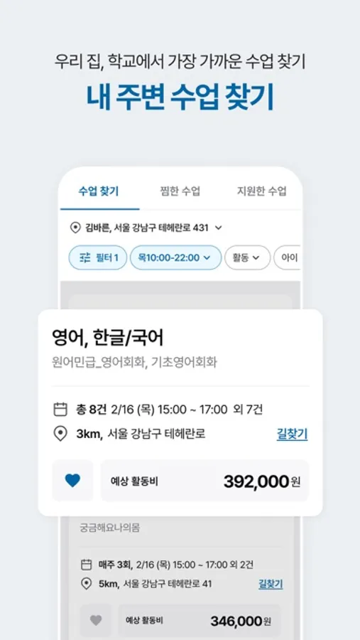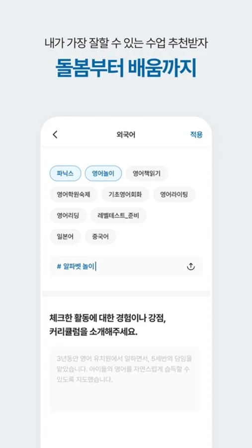 회원가입으로 선생님 정보를 입력하고 예비 선생님 OT에 참석해주세요. 기본 교육과 인터뷰 후 자란다 선생님으로 활동하실 수 있습니다! 이동거리도 아이성향도 나에게 잘 맞는 수업을 간편하게 찾아보고 추천받으세요.