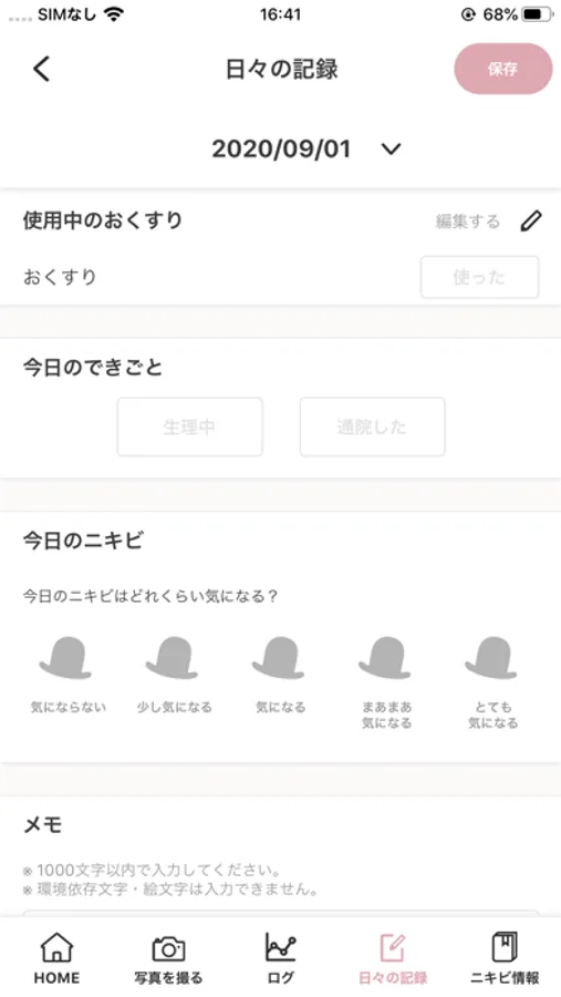 ニキビが気になる部位を写真撮影したり、おくすり・今日のできごとをアイコンでタップするだけで簡単に毎日の記録を行うことができます。また、気になることをメモに記録することもできます。