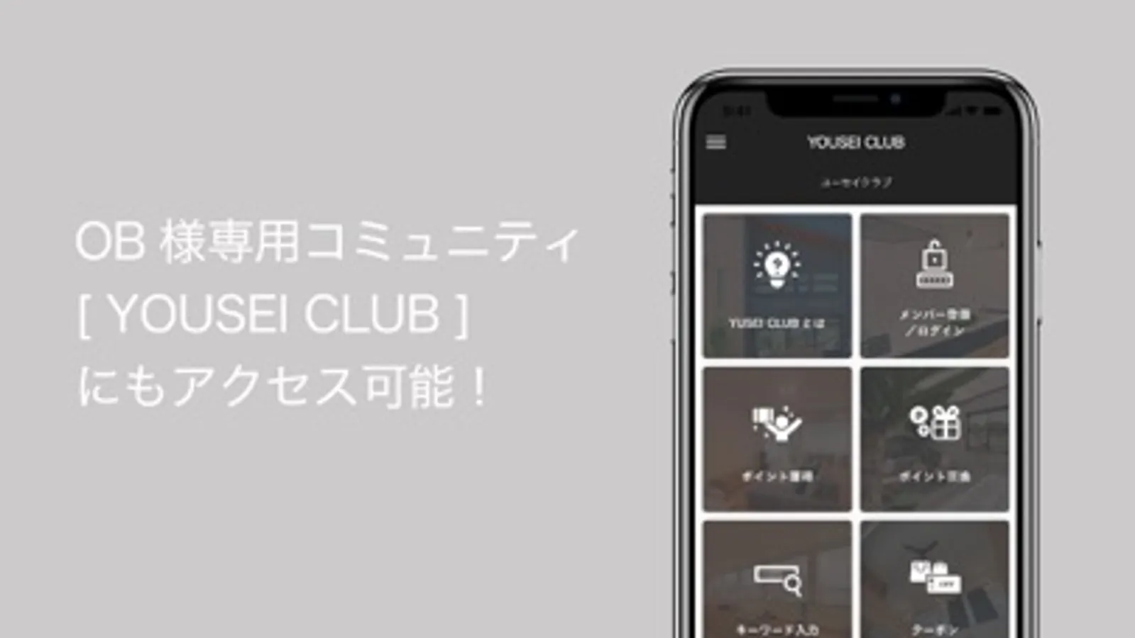 また、OB様専用コミュニティ「YOUSEI CLUB」も利用でき、OB様にも活用していただけるアプリとなっております。
