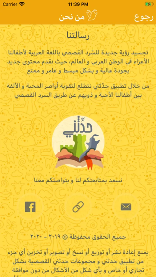 9. خصوصية: تطبيق حدِّثني و لا يقوم بتسجيل أي معلومات شخصية عن المستخدمين و لا يسمح بأي مواد دعائية أو إعلانية تجمع معلومات عن المستخدم للحفاظ على مستوى عالي من الأمان و الجودة لأطفالنا