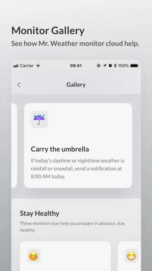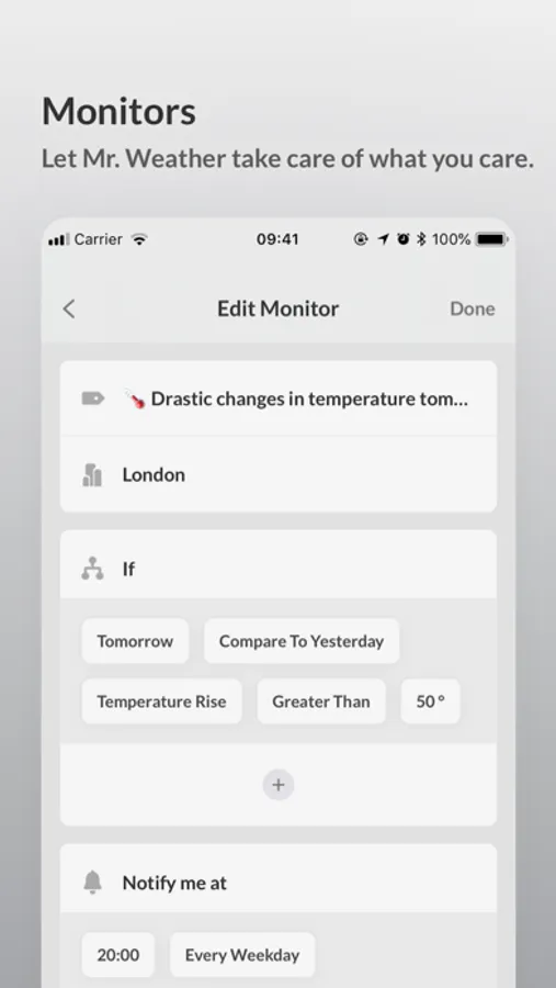 Mr. Weather will observe it and let you know when the conditions you set been satisfied. What to see if you need to bring an umbrella today, or if it's a poor air quality day? Just let Mr. Weather takes care of what you care about.
