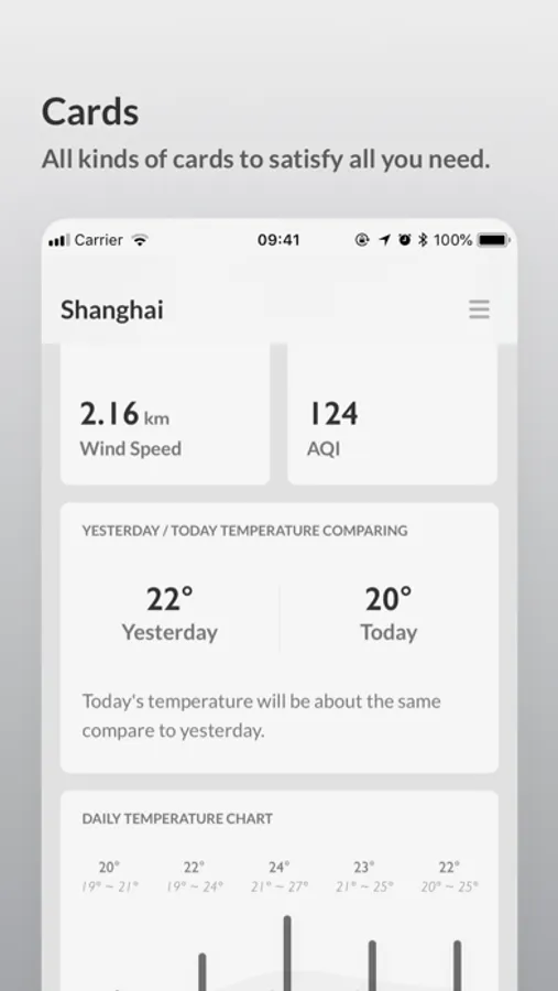 Mr.Weather 2 includes seven categories of cards, more than 50 number of cards you can choose. Realtime precipitation or temperature variation trend, you can always find one card which satisfies what you need. Check what you care, in a brand new way.
