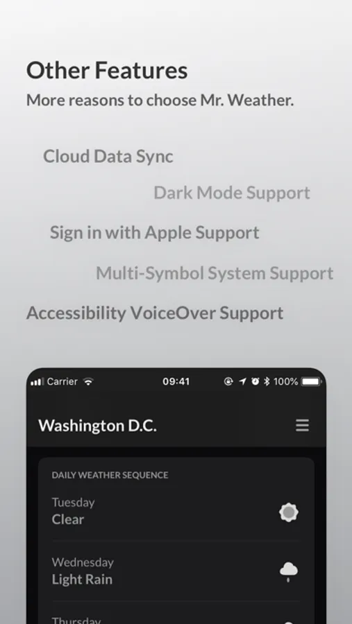 Mr. Weather supports a couple of Apple's latest technologies. Like Dark Mode and Sign in with Apple (Require iOS 13). So you can unlock the full power of iOS and your iPhone.