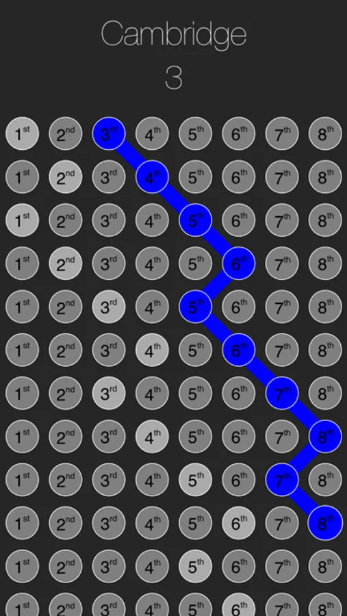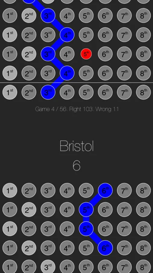 The app randomly selects a method and a place bell and invites you to touch the appropriate place for the your bell in each row. At the lead end another method and place bell are selected at random. At the end of the game a results table is shown.