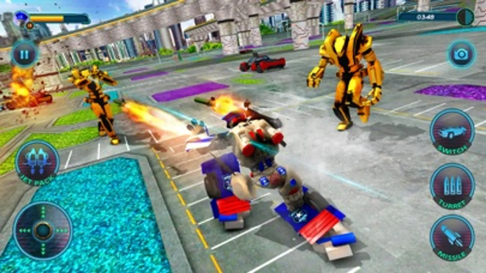 Save humankind from evil machines. Transform robot car into a flying robot to use combat powers like shooting, punches, firing missiles and car destruction skills.