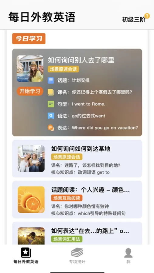 5类智能课程:场景原速阅读、场景原速会话、标准语句表达、场景词汇用法、标准语音纠正,全面提升话题阅读、语言功能、语法、单词、发音等五大方面的能力。