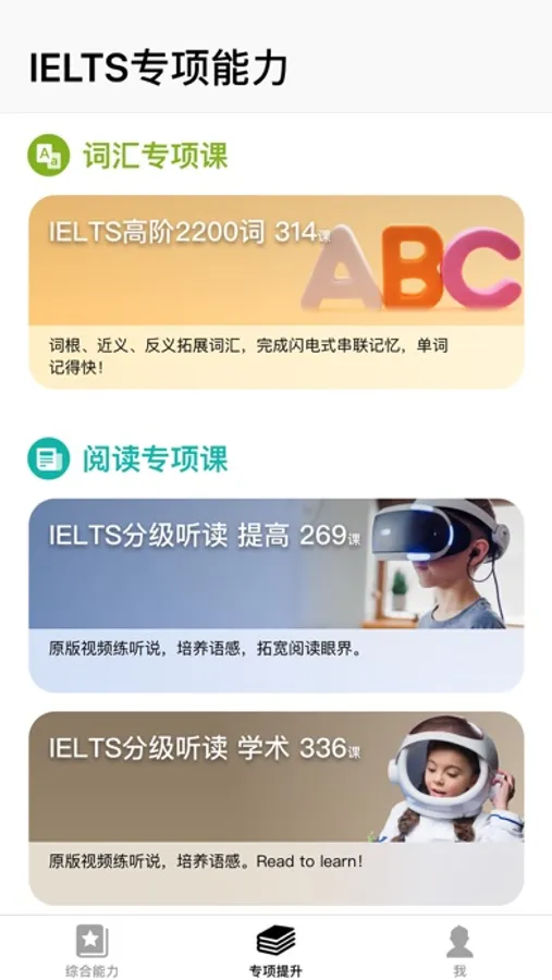 盒子鱼智能学练系统通过18类的智能练习,全面调动各种记忆感官,全面淬炼各项能力。迅速达到IELTS国际体系能力要求。