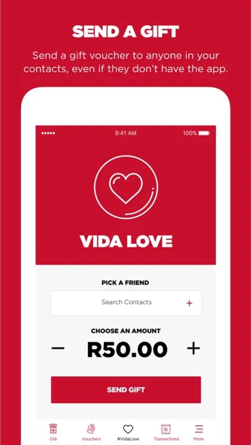 - vida fans can now share the love by making in-app purchases for vida vouchers to the value of R50 with R25 increments. These vouchers can easily be shared with friends who will then be able to redeem the full value of the voucher at their nearest participating vida store.