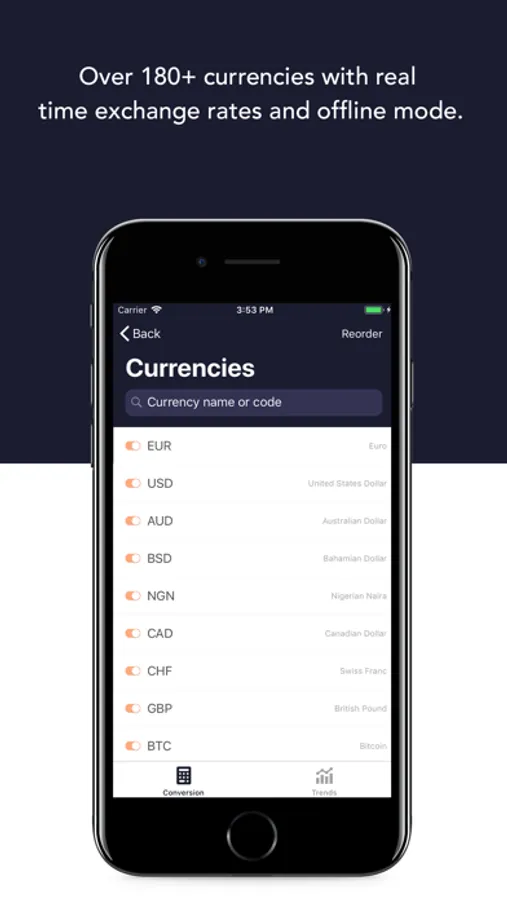 - Search function to quickly add a new currency