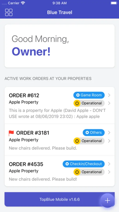 TopBlue is designed to allow you to manage your property at distance. It keeps you updated about what's going on at your properties and allows you to create work orders and order services.