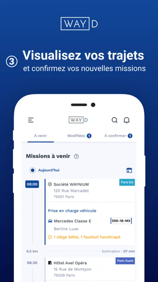Les chauffeurs en relation avec les entreprises ayant souscrit aux services sont ainsi dotés de l’application WAYD, leur permettant de recevoir les courses à réaliser, et permettant à leurs donneurs d’ordre de suivre en temps réel l’état d’avancement des prestations et services réalisés.