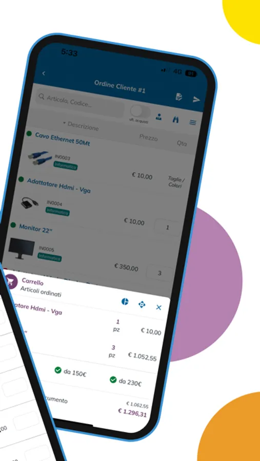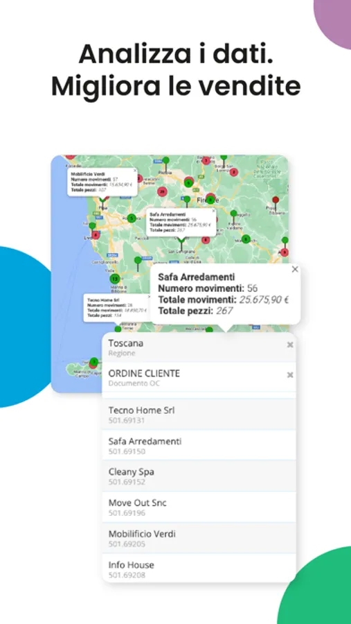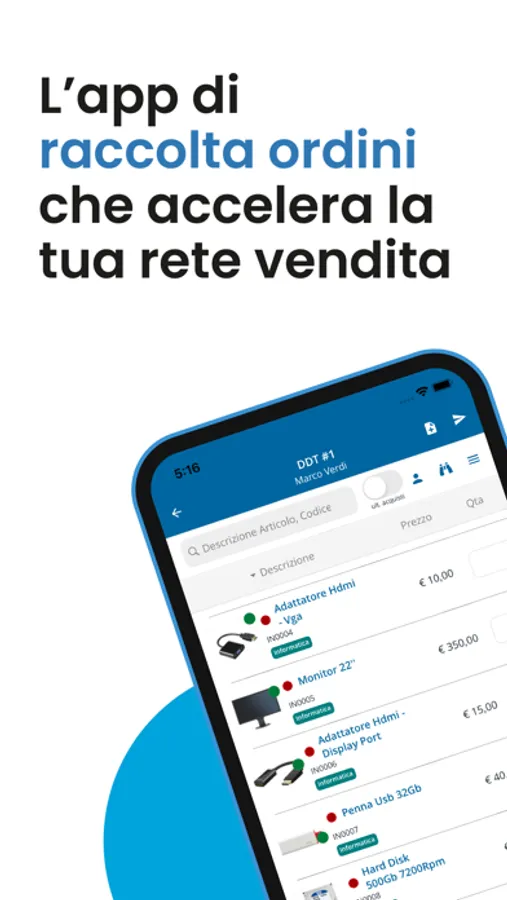 • Gestione Ordini: permette la raccolta e la gestione degli ordini direttamente dal cliente, fruibile anche offline e gestisce contestualmente anche le anagrafiche dei clienti