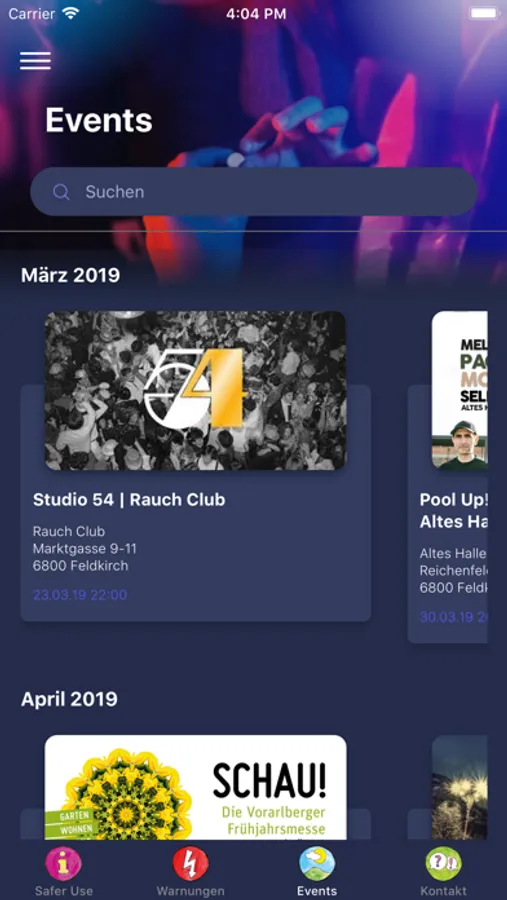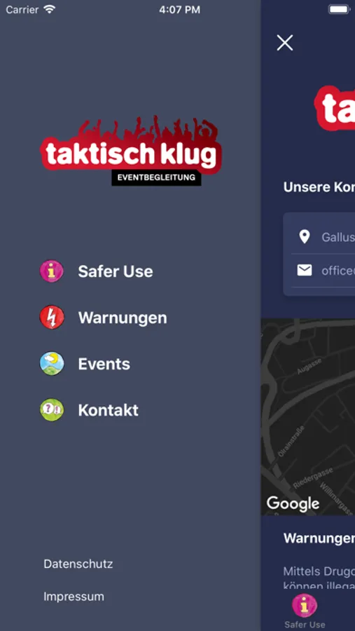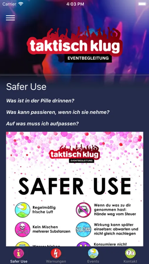 Außerdem bietet dir die App einen Überblick, welche kommenden Events von uns begleitet werden. So kannst du dich mit deinen Fragen auch persönlich und anonym an uns wenden. Denn die taktisch klug Eventbegleitung ist eine gesundheitsfördernde Maßnahme, finanziert von Sozialfonds Vorarlberg, die bei unterschiedlichen Veranstaltungen vor Ort das sichere Feiern fördert – niederschwellig, vertraulich und wertschätzend.