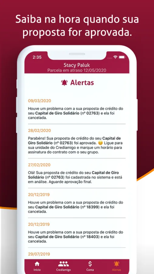 - Os alertas vão avisar você sobre o andamento da sua renovação de crédito, assim você se planeja melhor,